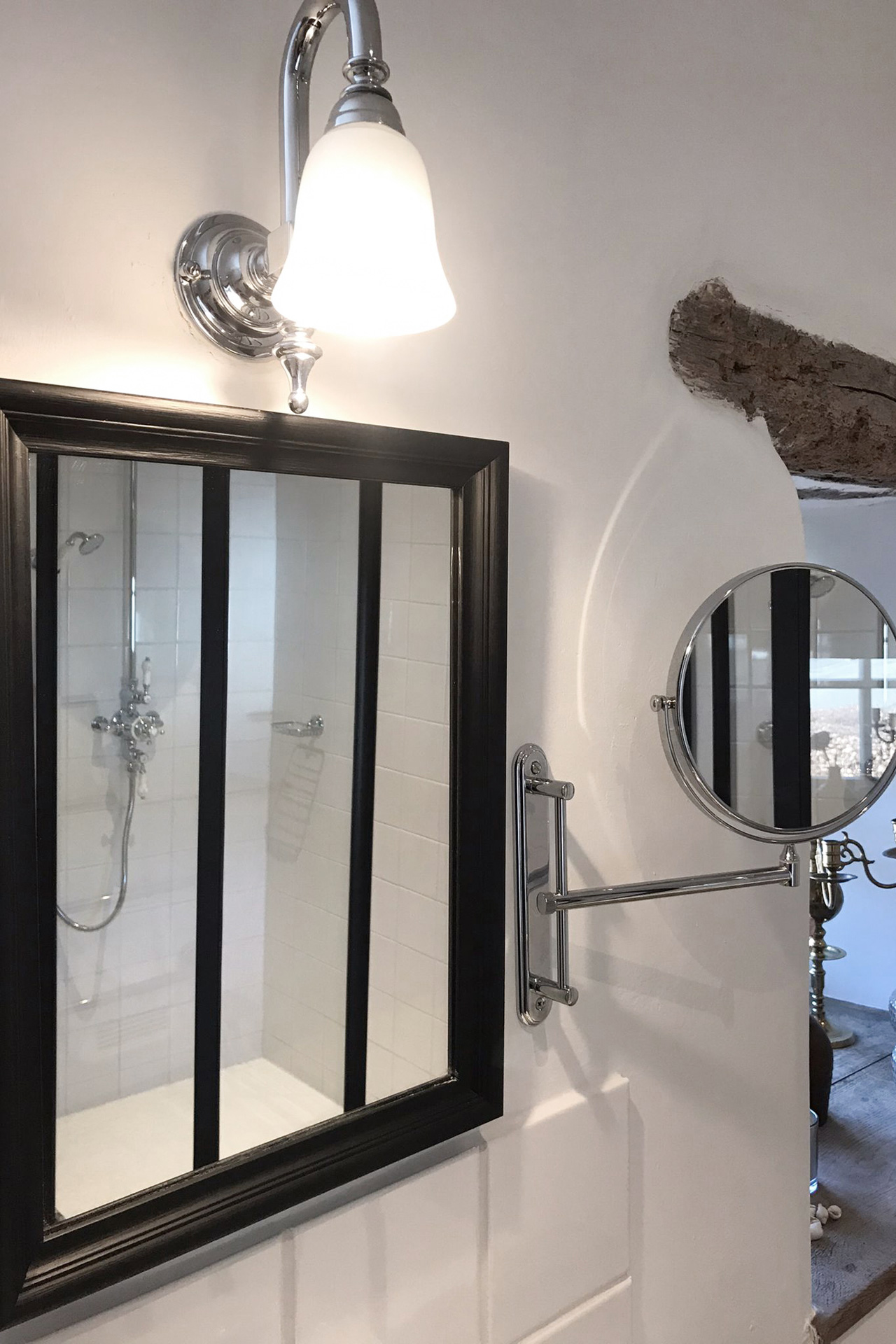 De luxe instapdouche en badkamer zijn geheel in stijl volgens klassiek Engels model.